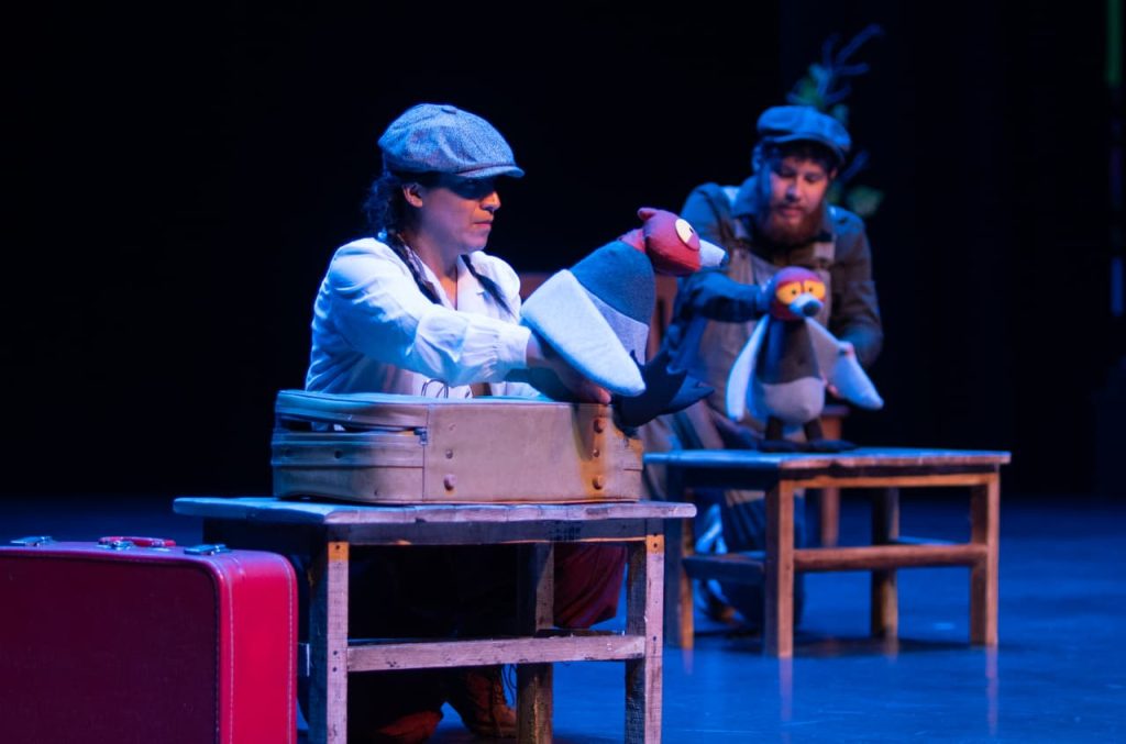 Él, operador de la máquina 2520, aparece como una figura que transita entre lo real y lo imaginado. No le permite subir al tren, pero en su lugar le regala historias: relatos que caben en una maleta y que desbordan lo cotidiano. Ahí vive Aristides Bombástico, ese ojo que todo lo ve, que revela lo evidente como si fuera un misterio; ahí también habitan un par de patos hermanos, tan opuestos como entrañables, que cruzan el escenario con humor y desasosiego.