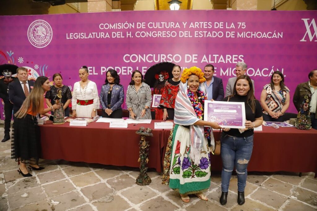 A su vez, la diputada Andrea Villanueva Cano, habló de la importancia de llevar a cabo por segundo año el concurso de altares y confió en que quedará como una de las actividades que el Congreso tendrá que hacer año con año, y es que en Michoacán “todo se vive intensamente, aquí la muerte llena de vida los hogares, panteones, veredas y calles que, rebosantes de altares, flores, comidas y velas, manifiestan la riqueza tradicional de este bello Estado”.