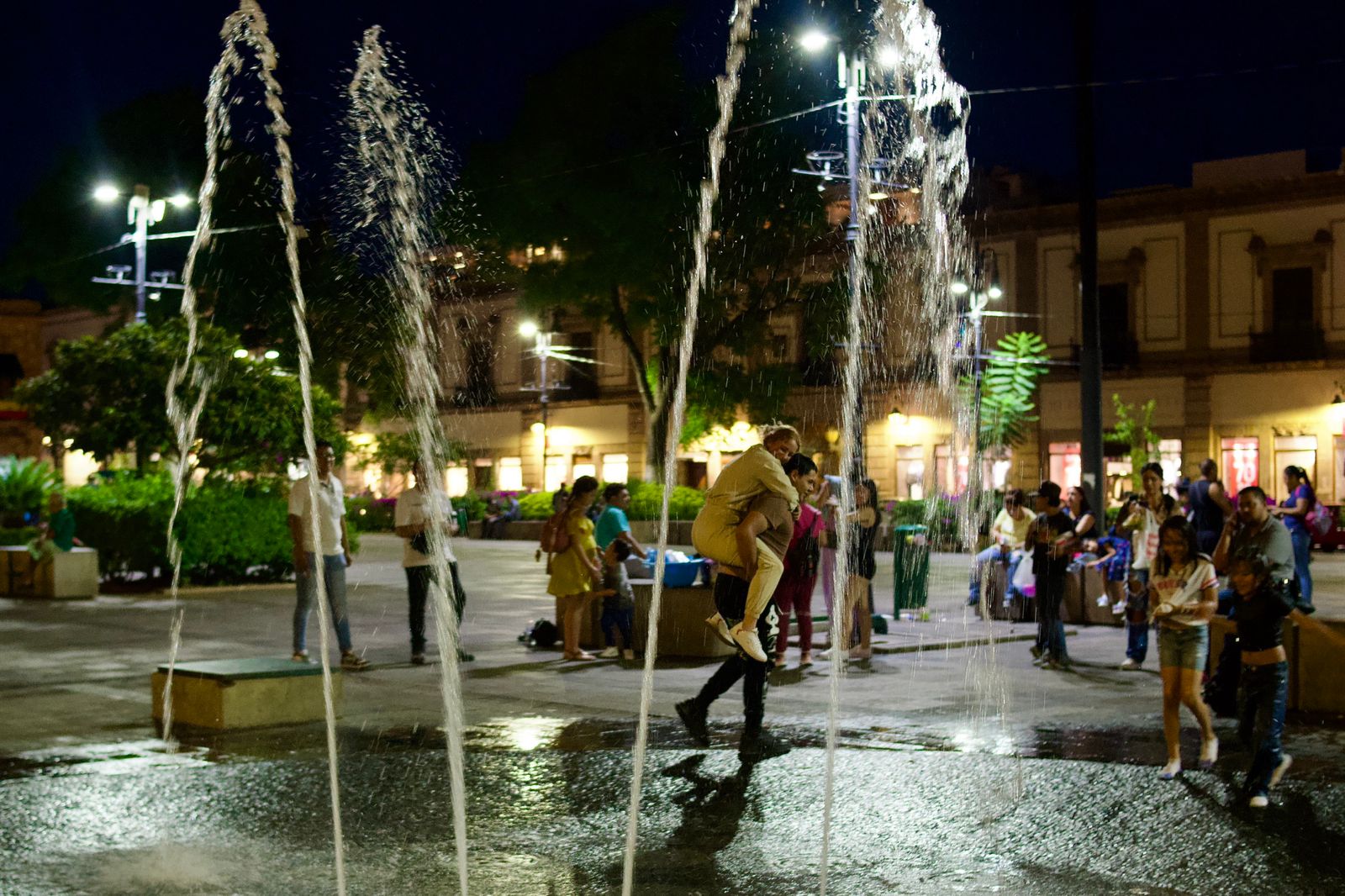 Estando la tarde ya más fresca y con las fuentes de la plaza Melchor Ocampo encendidas, se vuelve un punto de reunión para los ciudadanos que llevan a sus hijos a refrescarse con el agua y mientras los niños juegan, hay uno que otro adulto que también considera hacer lo mismo.