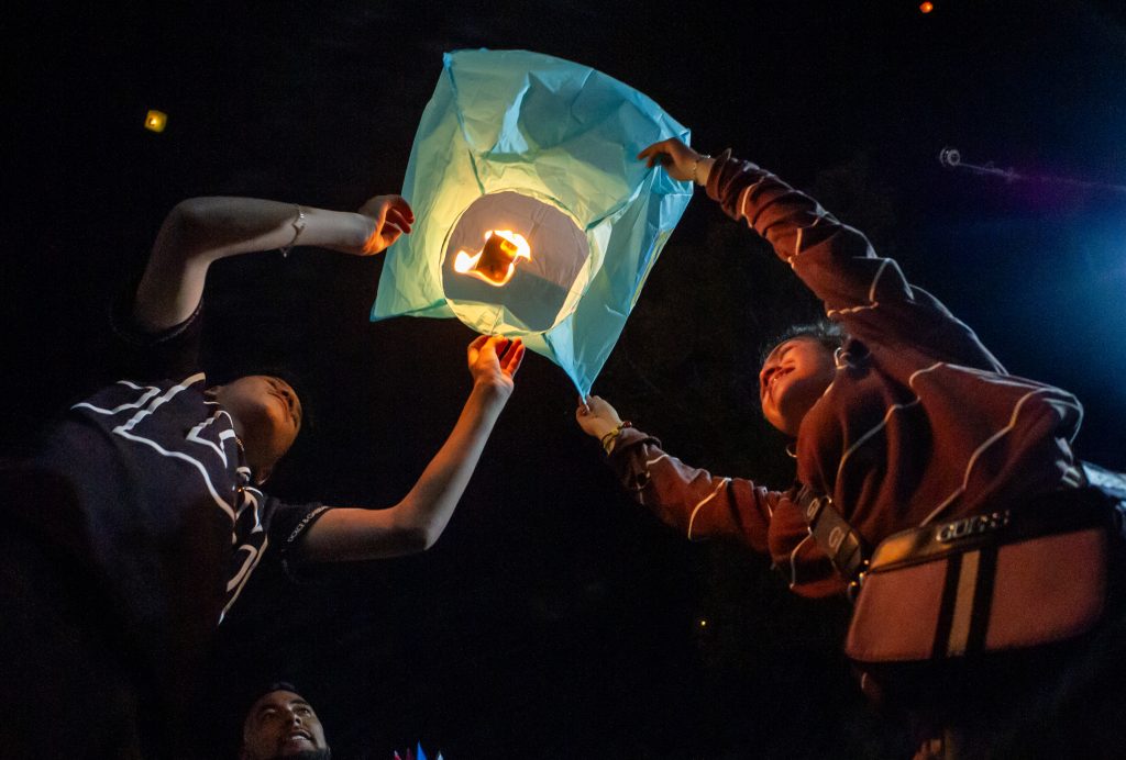 Entre el humo y las ráfagas de viento, aparecen personajes entrañables: Groot, Stitch, Bob Esponja, Spiderman, Labubu… y entre ellos también flotan corazones, estrellas y figuras más redondas. Algunos globos se resisten a volar, otros se enredan en ramas o cables, arrancando suspiros o risas nerviosas. Pero cuando uno logra despegar y se eleva sin contratiempos, el aplauso es unánime. El alivio y la alegría se sienten en el pecho, como si ese vuelo también llevara algo más que papel: los deseos de quien lo soltó.
