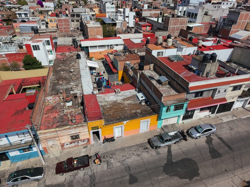 A unas calles de ahí, sobre Tejedores de Aranza, otra vecindad aguanta. La fachada amarilla con letras negras anuncia la renta de cuartos con baño y cocina. Al cruzar la entrada, los colores naranjas y verdes del interior contrastan con la ropa tendida que atraviesa el patio central de extremo a extremo.