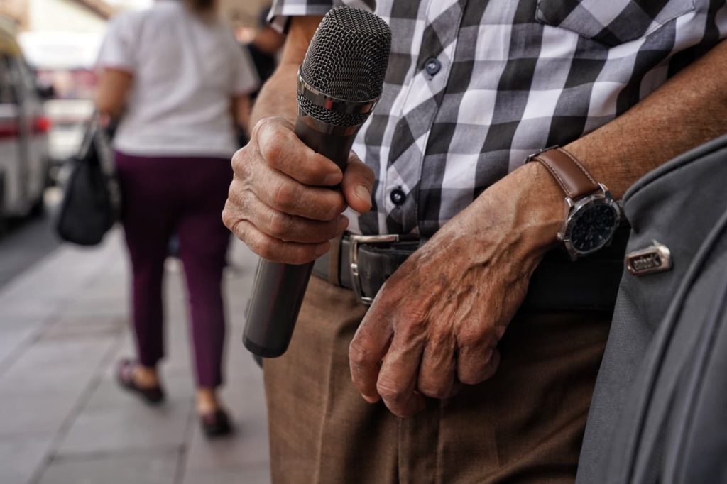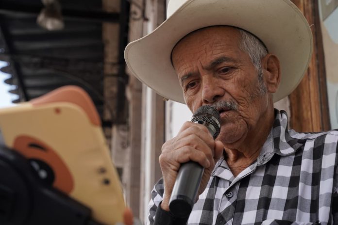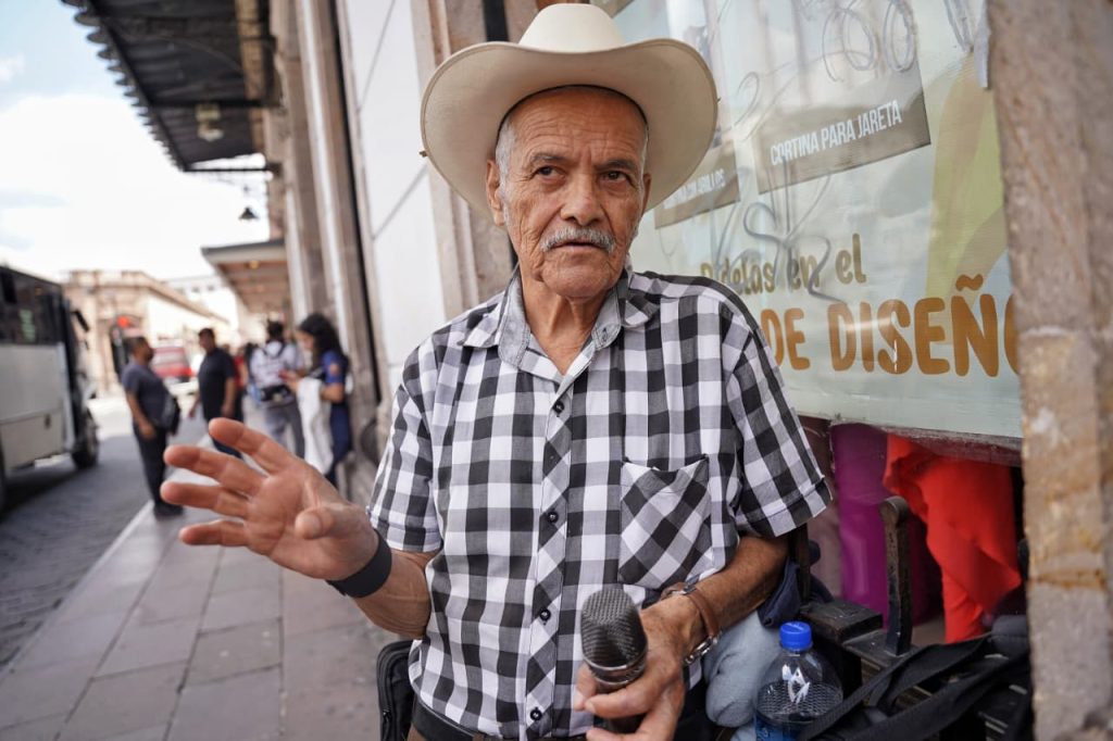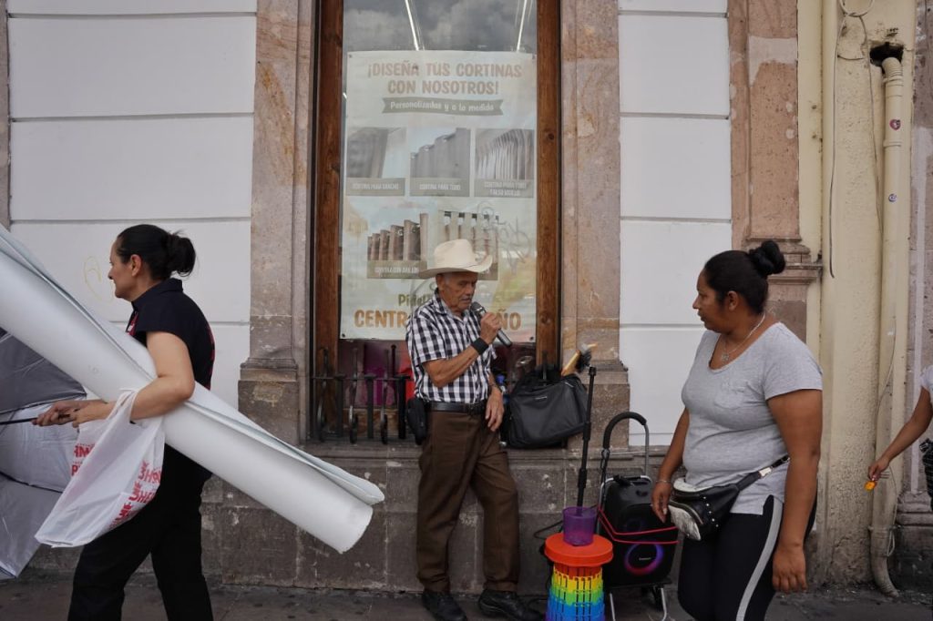 Morelia, Michoacán.- Sobre la calle Allende, en pleno corazón de Morelia, se escucha la voz de Don Reyes Árciga, que a sus 70 años sigue afinando la vida con canciones rancheras. Con texana bien puesta y camisa a cuadros, entona “No soy monedita de oro” del cantautor mexicano Cuco Sánchez, mientras acomoda el micrófono y espera la respuesta de la gente.