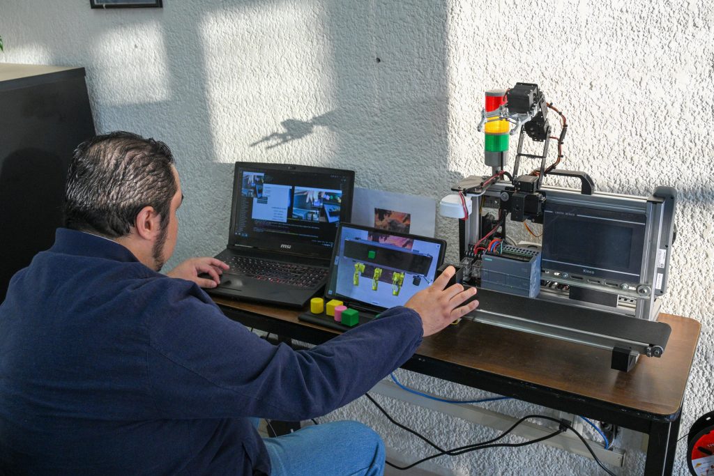 El gemelo digital también adquiere información mediante encoders y controladores lógicos programables, conocidos como PLC, que registran movimientos, posiciones y tiempos con alta precisión. Estos datos viajan a través de una red interna que conecta cámaras, computadoras y tabletas, permitiendo el monitoreo y control del sistema en tiempo real.