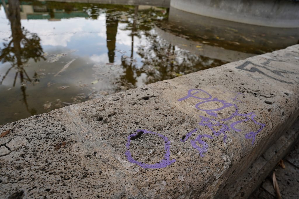 Pese a la limpieza parcial, el deterioro general del espacio es evidente. No hay botes de basura, ni iluminación adecuada, ni vigilancia visible. La fuente, que alguna vez tuvo vida y circulación de agua, ahora refleja solamente el abandono, junto con los grafitis que se acumulan. sobre su superficie.
