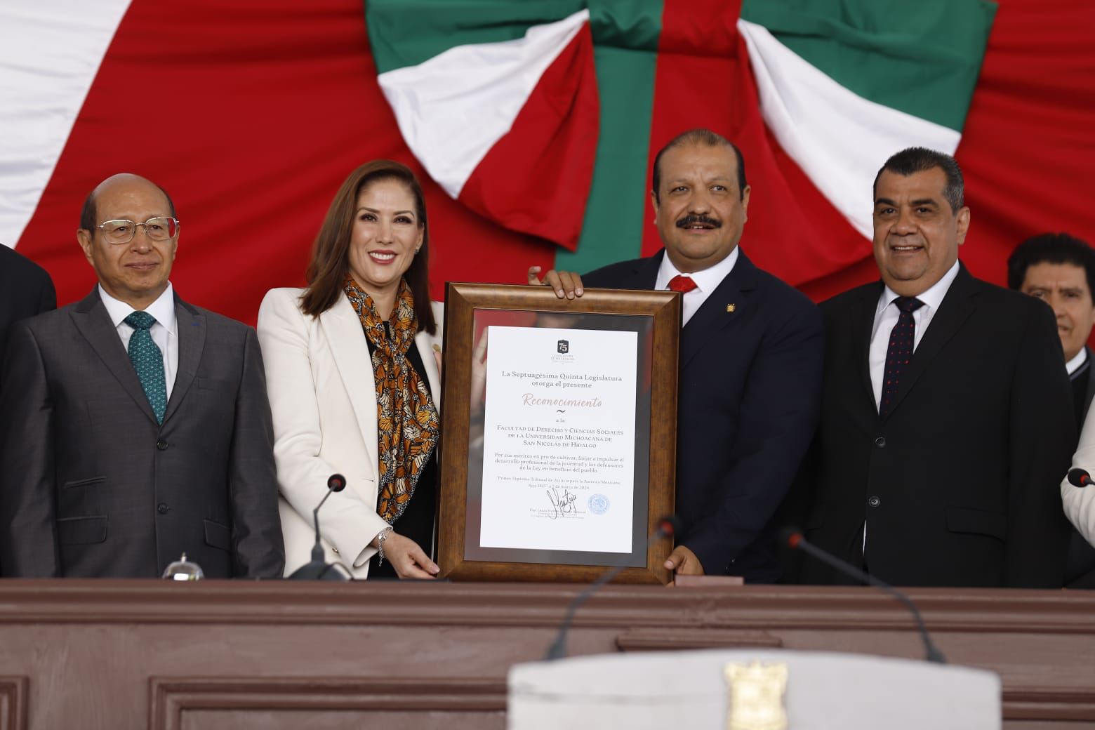Ario de Rosales, Michoacán, a 07 de marzo de 2024.- Con un llamado a honrar la historia, defendiendo nuestras libertades plasmadas en la Constitución, la 75 Legislatura de Michoacán hizo entrega de la Presea “Primer Supremo Tribunal de Justicia para la América Mexicana, Ario 1815”, a la Facultad de Derecho y Ciencias Sociales de la Universidad Michoacana de San Nicolás de Hidalgo (UMSNH).