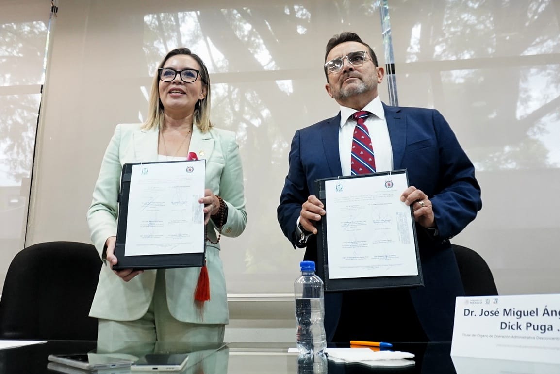 Morelia, Michoacán. – La rectora de la Universidad Nicolaita, Yarabí Ávila González y el Titular del Órgano de Operación Administrativa Desconcentrada Regional Michoacana del IMSS, José Miguel Ángel Van-Dick, realizaron la firma de un convenio, para recibir practicantes en el área administrativa del Instituto.