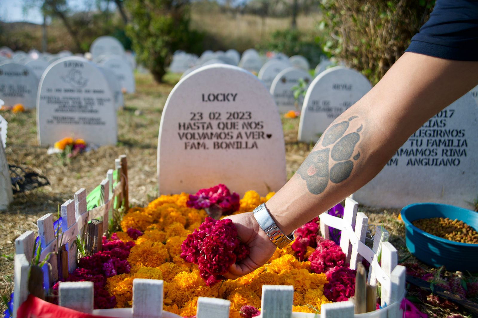 Anabel Tapia también acude al cementerio de mascotas, en compañía de sus hijos, para entre todos adornar la tumba de sus lomito Romina y pasar un rato ahí con ella, mencionando que desde 2019, acuden el primero de noviembre para continuar con esta tradición. Anabel es rescatista independiente de lomitos en Cuitzeo y menciona que en su familia tienen mucho amor por los lomitos tanto, que al partir Romina para honrar su memoria, decidieron sepultarla. “Para nosotros son parte de nuestra familia, desde el primero que tuvimos han sido miembros de la familia y les hacemos este pequeño tributo para que sepan que no los hemos olvidado”.