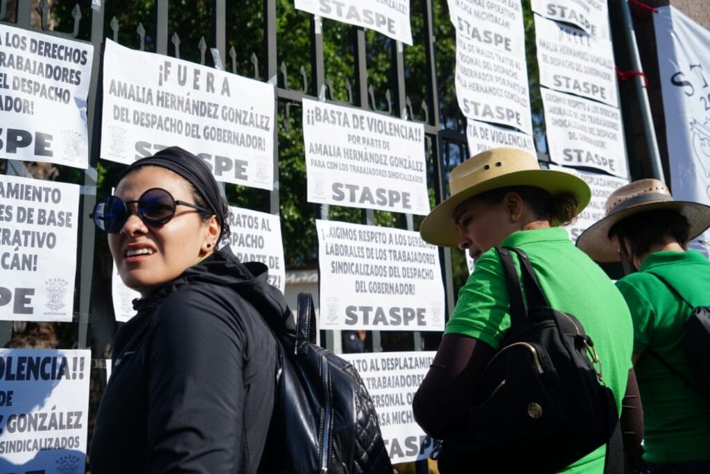 Morelia, Michoacán – Integrantes del Sindicato de Trabajadores al Servicio del Poder Ejecutivo (STASPE) marcharon hasta llegar a Casa de Michoacán, exigiendo la destitución de Amalia Hernández por maltrato a los trabajadores.