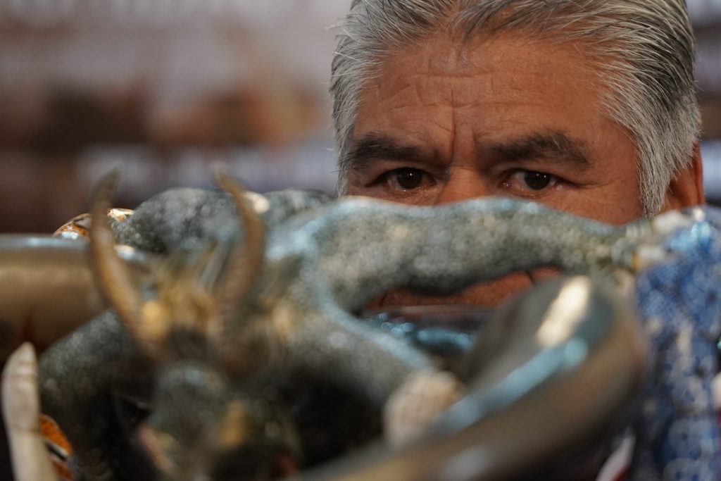 Morelia, Michoacán.- Felipe Horta, viene de la comunidad de Tócuaro, en la Meseta Purépecha, y desde hace más de 45 años se dedica a tallar máscaras de madera, esas que en su pueblo cobran vida durante las pastorelas y las danzas donde los diablos bailan, brincan y se burlan del mundo.