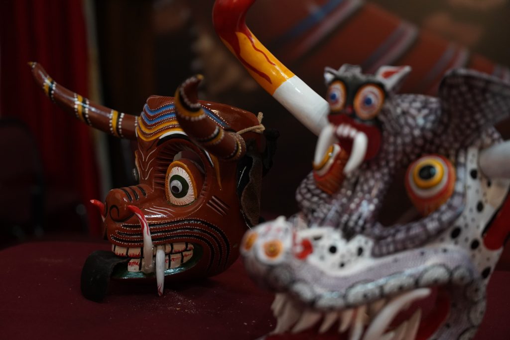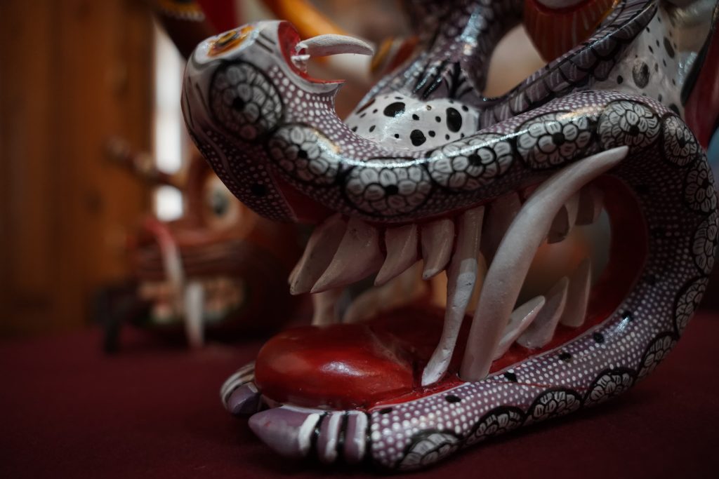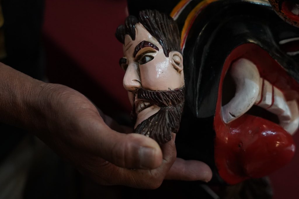 «El reto de una pieza grande es hacerla de una sola pieza, sin ensambles», explica mientras señala una máscara cargada de formas, serpientes y figuras que se enredan unas con otras. «Hay muchas máscaras muy buenas en todo el país, pero las de nosotros son especiales porque son de una sola pieza».